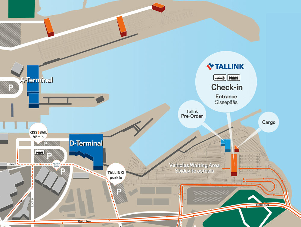탈린 항구 D 터미널에는 차량 통행 관리를 위한 스마트 포트 시스템(Smart Port system)이 가동하고 있습니다. 본 전자 시스템을 기반으로 한 차량 번호 인식기가 자동으로 차량 출입을 관리하며 승선 안내는 터미널의 스크린에서도 보실 수 있습니다.